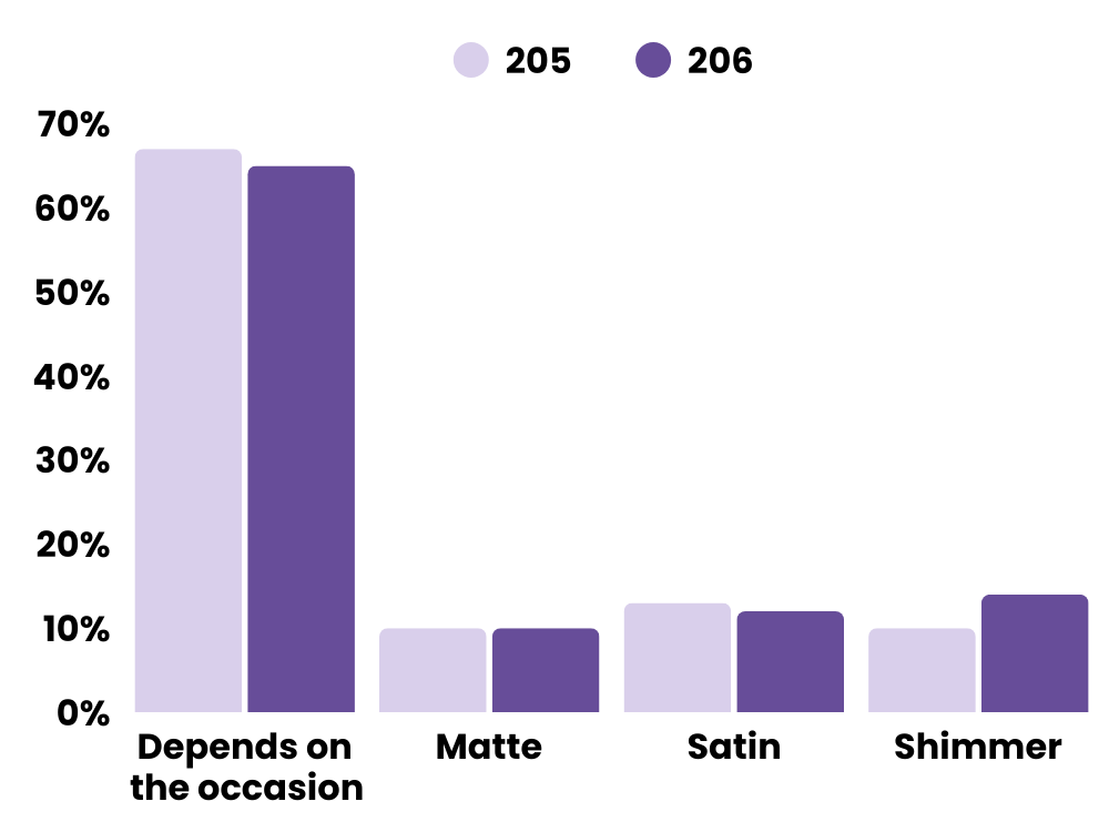 The standout movement is shimmer at +4%, indicating a modest return to glow. While consumers still adapt finishes based on occasion, subtle luminosity is regaining traction.