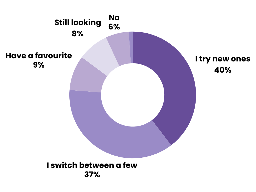 When asked about their go-to brand or product for masks and treatments, the majority of respondents like to explore new options, with 40% trying new products all the time and 37% switching between a few favourites. A smaller portion, 9%, have a single favourite product they always return to, while 8% are still searching for their ideal option. Only 6% said they don’t have a go-to at all, and just 1% prefer natural or DIY masks. This suggests that most users enjoy experimenting and discovering new skincare products rather than sticking to one brand.