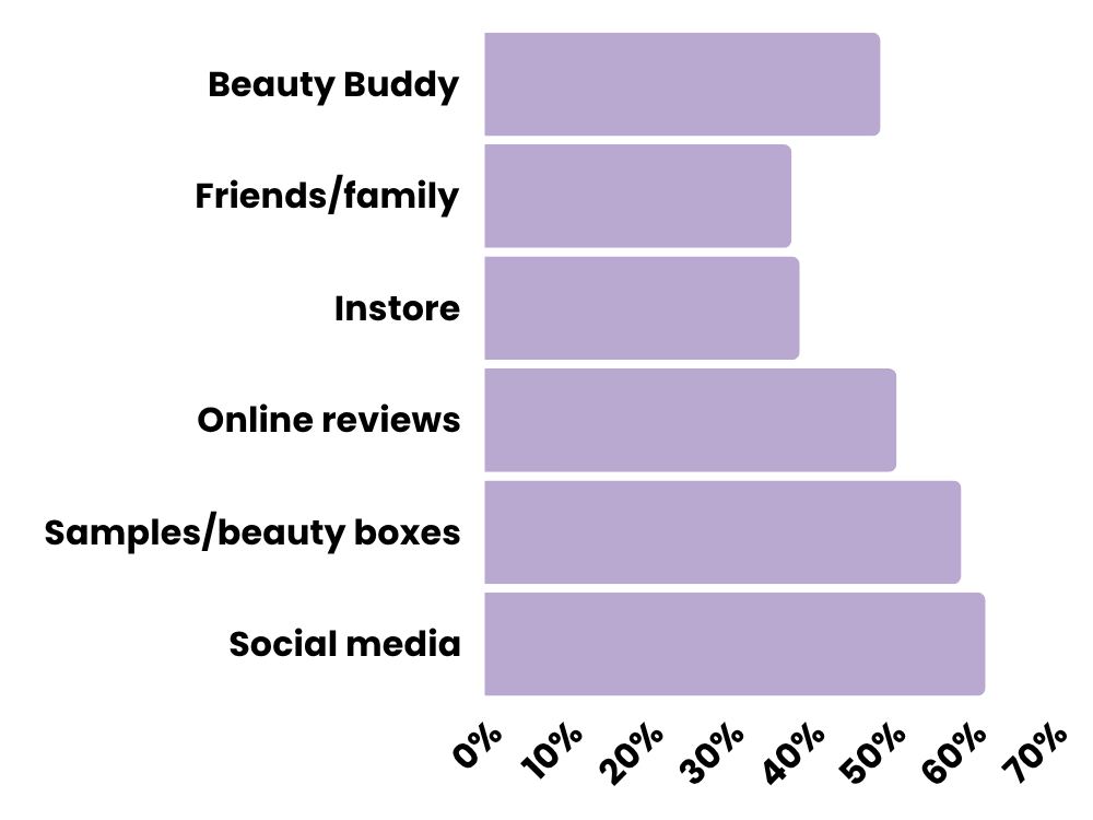 When it comes to discovering new masks or treatments, respondents rely on a variety of sources. Social media is the most popular, with 62% discovering products this way, followed by samples and beauty boxes at 59%. Online reviews influence 51% of participants, while Beauty Buddy is a source for 49%. In-store browsing attracts 39%, and recommendations from friends and family guide 38% of respondents. This shows that both digital platforms and hands-on experiences play a significant role in how people find new skincare products.